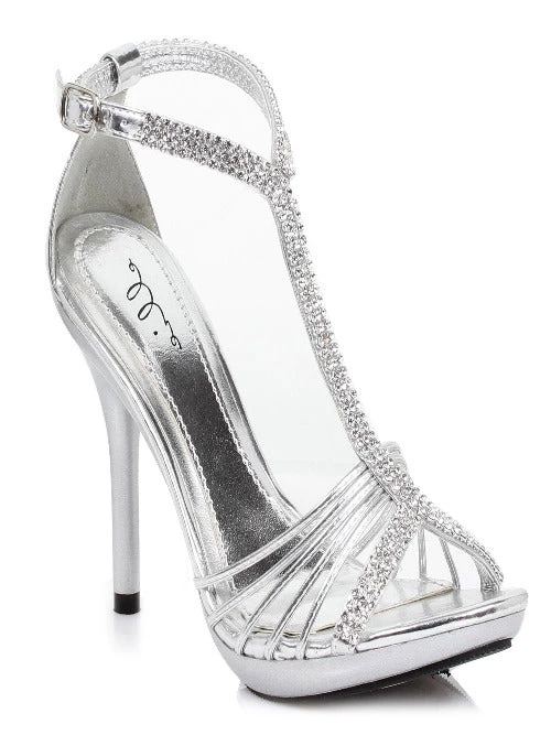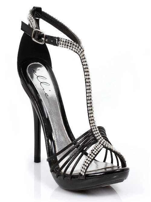 - Open-toe dress sandal featuring rhinestone-accented T-strap upper