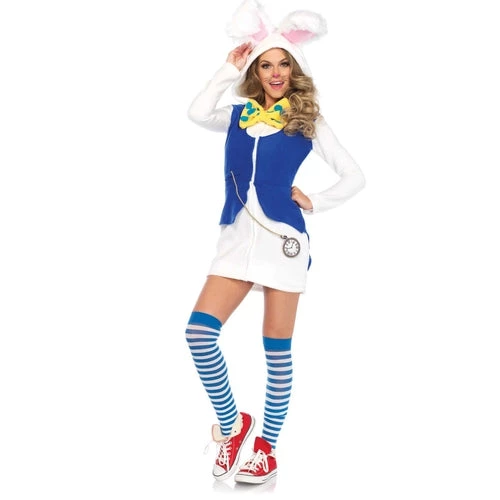 Don’t late for a very important date with the ultra soft and adorable Cozy White Rabbit costume by Leg Avenue. This fun Halloween costume features fleece zipper front dress with dotted bow tie, a delightfully furry ear hood and matching tail, and attached velcro cross body pocket watch.