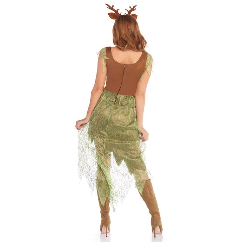 The perfect mix of flirty and fantasy, the 2 PC Woodland Fawn womens costume by Leg Avenue is one of our favorites. This cute Halloween costume features a darling deer costume dress with an asymmetrical tattered sheer leaf skirt and lace up front, an attached vine belt with tiny leaf accents, and comes complete with the matching antler headband. Complete your look with your own adorable DIY deer makeup!