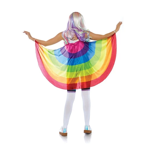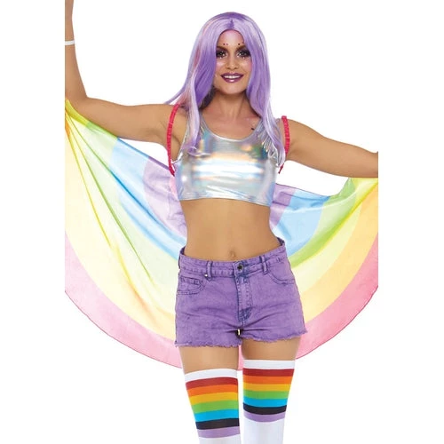 - From Pride to summer festival season, add a vibrant vibe to any look with the Leg Avenue Rainbow Wings. The cute and colorful festival wings feature a vibrant rainbow pattern and flowing semi circle design. For comfort and ease of wear, these wings are complete with stretchy elastic back straps and wrist straps. For a Pride-Ready look, pair these bold wings with the Leg Avenue 2-Piece Holographic Metallic Spandex Bandeau and Shorts set and the Multi Color Jovi Face Jewels. Care: Hand wash in cold water and drip dry – NOT heat resistant. Perfect for Halloween, DIY theme costumes, music festival, theater props or dance wear. One Size Fits Most Adults and Teens – 100% Polyester