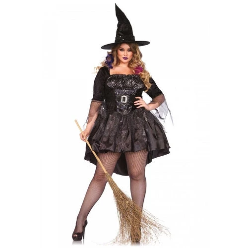 Grab your broom and take flight in the 2 PC Black Magic Mistress witch costume by Leg Avenue. This spellbinding plus size Halloween costume includes a high/low witch dress with foil star ruched bodice and tattered glitter tulle skirt accent, attached sequin belt, and matching witch hat. (Broom not included)
