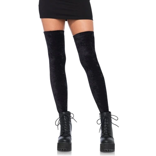 These thigh high stockings include thick crushed velvet footed leggings that fit comfortably around the thigh.