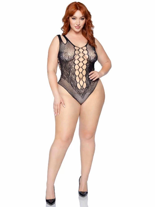Bring the heat in this sultry plus-size lingerie teddy by Leg Avenue. Net and lace design with a plunging wide net front and low, close back, this bodysuit is perfect for layering, lounging, or flirty bedroom fun.