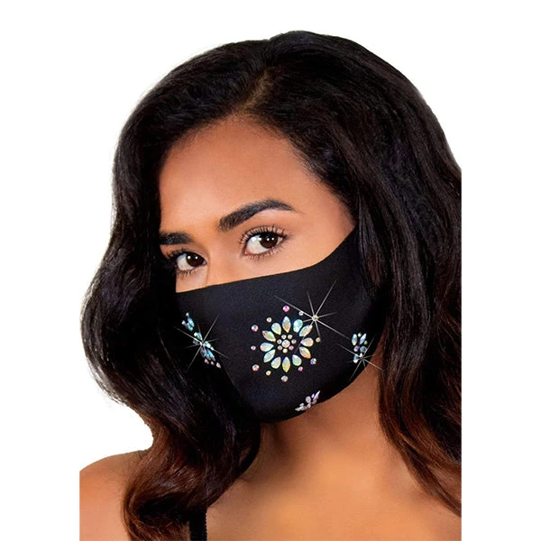 The Fleur 3D rhinestone reusable face mask for women features a gorgeous rhinestone flower pattern, cloth ear covers for ultra comfort. Stunning all-over AB rhinestones provide an iridescent shimmer, guaranteed to make you stand out in the crowd. Can be worn over your surgical mask as a fun fashion accessory or on its own as a protective face mask. This washable cloth face mask is perfect for home, office or for outside protection. The face mask is made from breathable poly-spandex and is reusable and hand washable. This is not a medically certified or tested product, but a so-called makeshift mouth-nose mask without special filter!