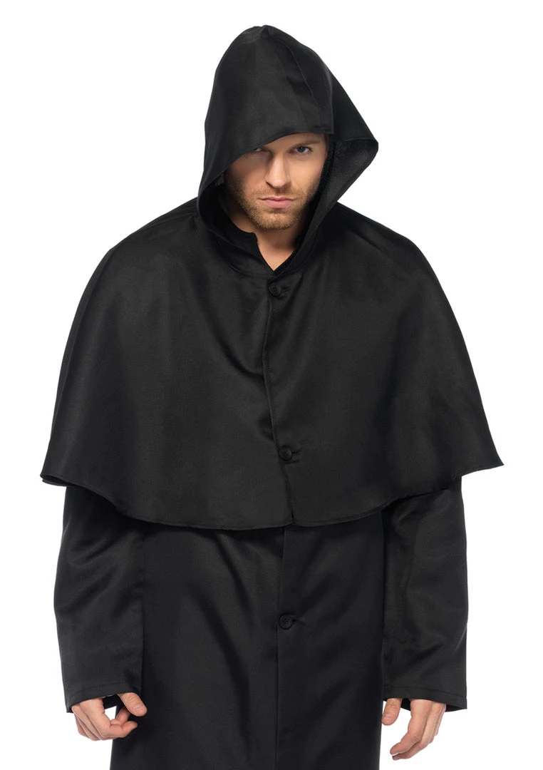 Hooded button front cloak.