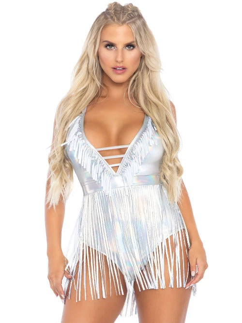 Wow them in this statement-making sexy bodysuit by Leg Avenue, featuring a plunging deep-v neckline, cross over back straps, full back panty, and lots of fringe for an unforgettable look. The silver bodysuit features iridescent fabric for a rainbow vibes that are perfect for rave outfits and the black bodysuit is a must-have summer festival outfit basic. Pair either fringe bodysuit with accessories and Leg Avenue leg wraps to take your summer looks to the next level. (Accessories shown not included)