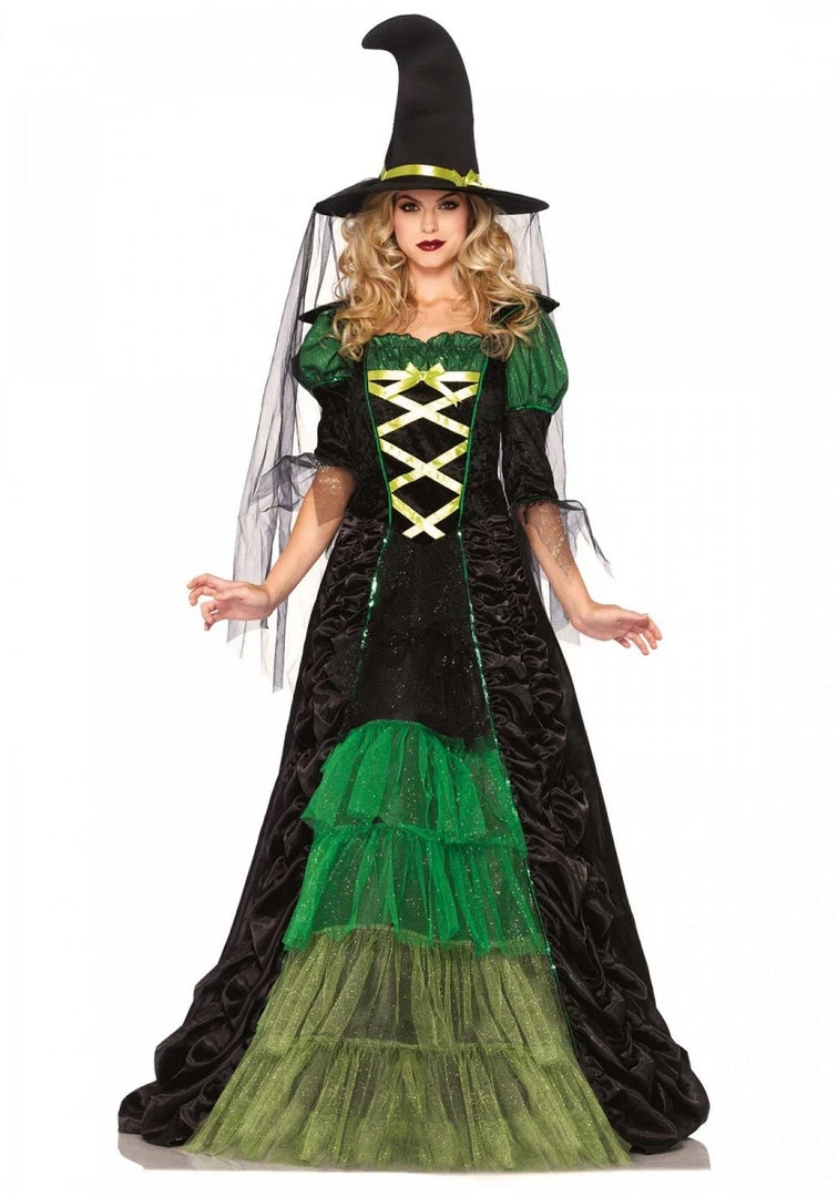 No love potions required to fall head over heels for the enchanting 2 PC Storybook Witch costume by Leg Avenue. This classic women’s costume features a stunning long satin witch dress with ruched skirt and tiered glitter tulle center panel, sequin trimmed stay up collar, and matching witch hat with long veil.
