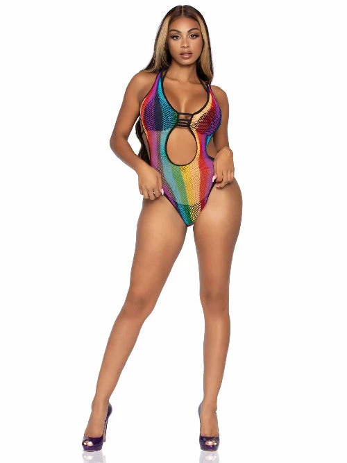 Its all blue skies and dreamy vibes in this sexy bodysuit by Leg Avenue, featuring a rainbow fishnet cut-out lingerie teddy with strappy bikini back. Looks amazing paired with festival outfits or as a swimsuit cover up. (Layered items shown not included)