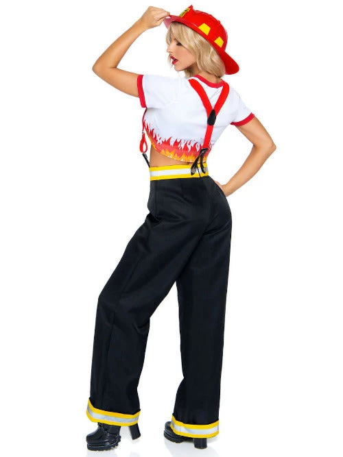 Look red hot this Halloween with the flirty 2 PC Five-Alarm Firefighter costume by Leg Avenue. This sexy costume includes a fire crop top and flared pants with attached suspenders and reflective trim. Fun design detail, amazing quality and great fit. Pair with a Leg Avenue fire hat to complete the look.