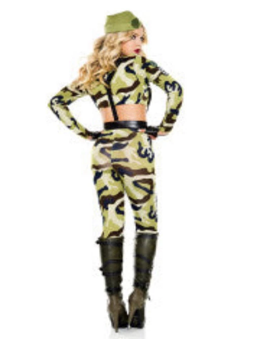 6pc. Commando soldier Includes: camouflage zip up top, camo pants, hat, adjustable suspenders, belt and gloves