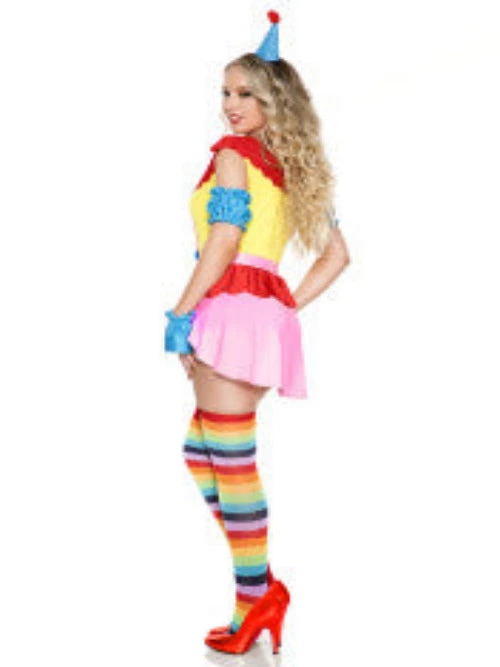 5 PC. includes: Multicolor skirt romper with pom pom accents, clown hat, arm bands, and gloves