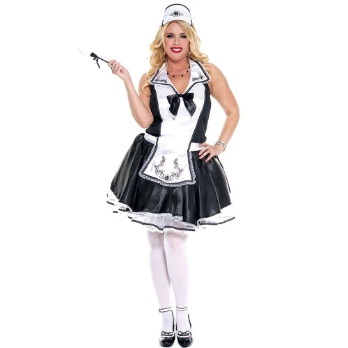 Ruffle dress with attached apron, bow, and embroidered collar, Headpiece and Duster