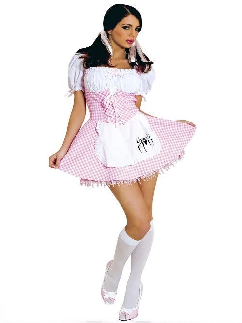 Pink Gingham Muffet adult costume includes a pink and white dress with attached apron. Petticoat and knee-high socks are not included.