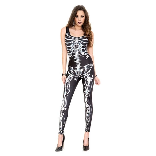 Add a dark edge to your costume with this 3D Skeleton bodysuit costume featuring a full body sleeveless leotard with skeleton print.