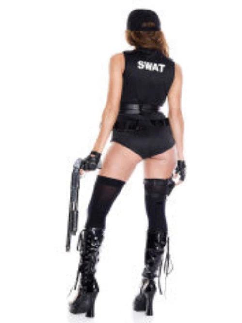 6 PC. includes: SWAT back print bodysuit with front zipper, buckle front accents, belt, SWAT hat, wet look gloves, and leg holster