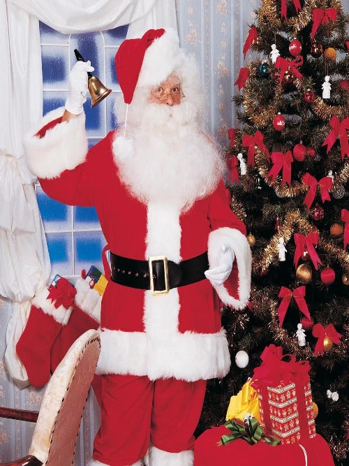 The Super Deluxe Velvet Santa includes a lined jacket, hat, pants, gloves, vinyl belt, and boot tops.