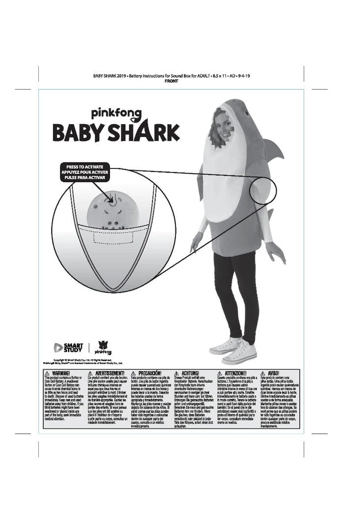 Officially licensed baby shark adult costume; look for trademark logo on packaging and labels to help assure you’ve received an authentic safety-tested item
