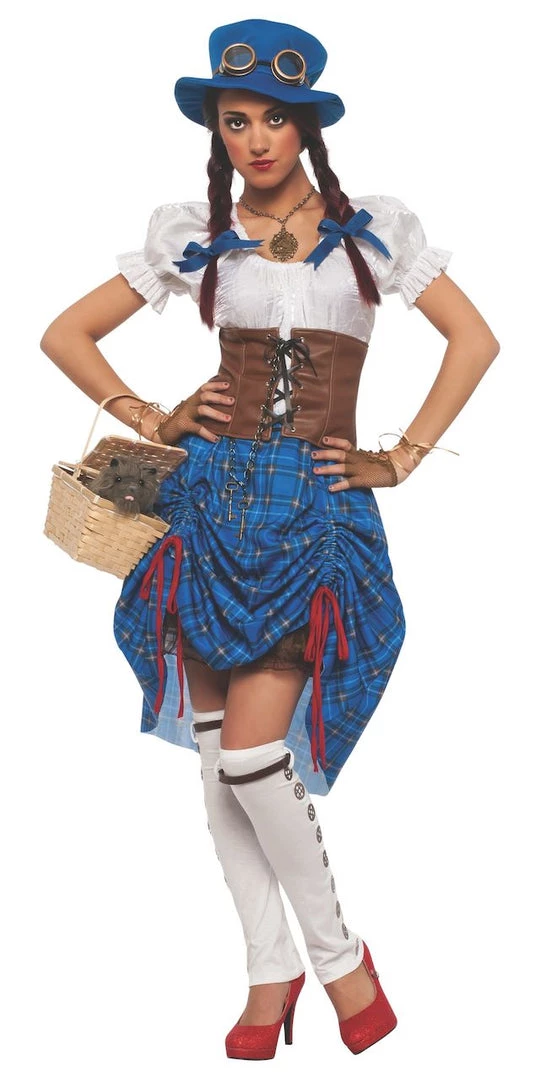 Dress, corset with chain, hat, goggles, hair bows, and leg covers