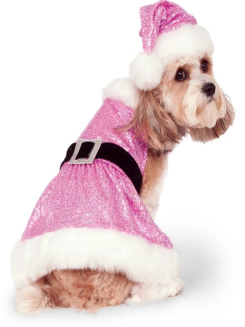 2-Piece Mrs. Claus pet costume includes pink sequined dress with attached belt and Santa hat with white faux fur trim and pompom